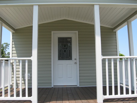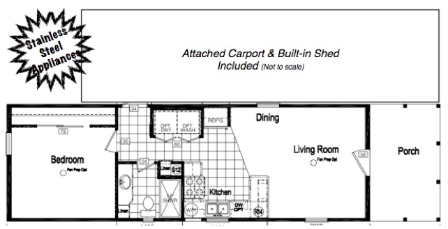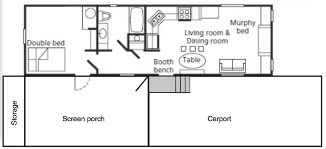 Our 1 bedroom Porch Cottage (as shown below) includes a classy front porch, attached carport and storage shed. The interior has a fabulous modern kitchen complete with stainless steel appliances. A dishwasher, rangehood microwave, smooth cooktop range, and side by side refrigerator with icemaker is included. The main living area typically includes a wood-look floor that connects to the kitchen. The bedroom and a nice bathroom with fiberglass tub/shower are located at the back of the home.